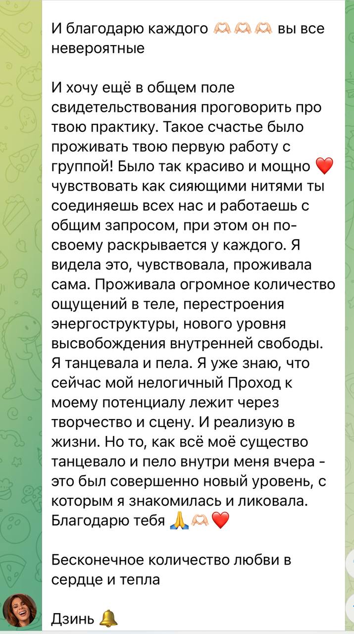 Я вижу и чувствую каждого участника и после работы со средним энергетическим телом раздаю результат работы каждому, кто находится в практике.